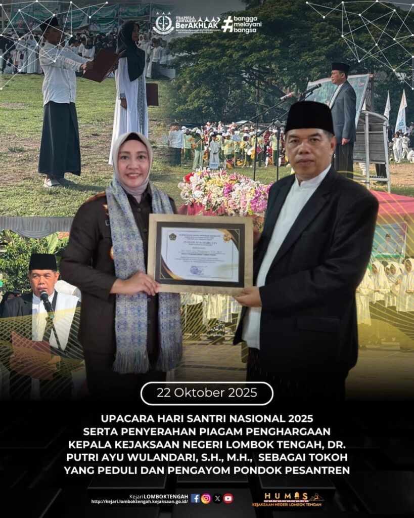 Lombokdaily.net -Kepala Kejaksaan Negeri Lombok Tengah, Dr. Putri Ayu Wulandari, S.H., M.H., menerima Piagam Penghargaan dari Kepala Kantor Wilayah Kementerian Agama Provinsi Nusa Tenggara Barat sebagai Tokoh yang Peduli dan Pengayom Pondok Pesantren. Penghargaan ini diberikan dalam rangka peringatan Hari Santri Nasional Tahun 2025 dengan tema “Mengawal Indonesia Merdeka Menuju Peradaban Dunia”. Penghargaan ini diberikan sebagai bentuk apresiasi atas kiprah Dr. Putri Ayu Wulandari dalam mendukung perkembangan, pembinaan, dan perlindungan komunitas pesantren melalui program “Jaksa Masuk Pesantren”. Program ini bertujuan memberikan pembinaan dan penyuluhan hukum di lingkungan pesantren untuk menciptakan lingkungan pendidikan yang aman dan berintegritas.