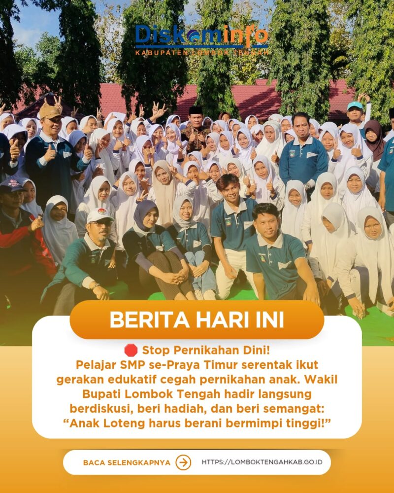 LOMBOK TENGAH, NTB – Upaya mencegah terjadinya pernikahan dini di kalangan remaja terus digencarkan Pemerintah Kabupaten Lombok Tengah. Pada Sabtu, 2 Agustus 2025, kegiatan bertajuk Launching Pencegahan Pernikahan Dini digelar secara serentak di tujuh sekolah menengah pertama di Kecamatan Praya Timur, dengan SMPN 1 Praya Timur sebagai pusat kegiatan utama.