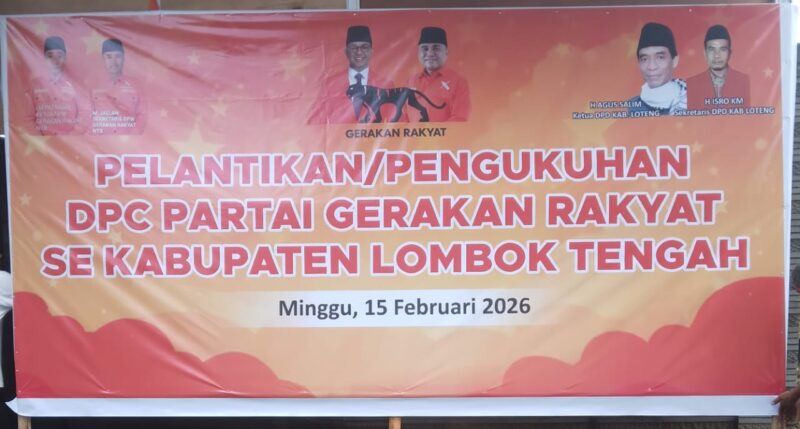 Lombok Tengah (NTB) -Partai Gerakan Rakyat Kabupaten Lombok Tengah akan mengadakan musyawarah dan pelantikan DPC pada hari Ahad, 15 Februari 2026, jam 13.00 Wita di Sekretariat DPD Partai Gerakan Rakyat Lombok Tengah. Acara ini diundang kepada seluruh pengurus DPC dan pengurus kecamatan.
