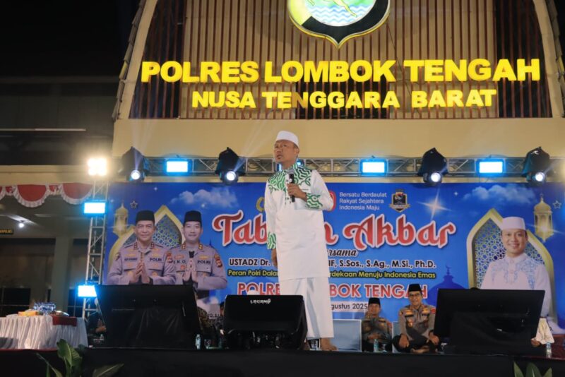 Lombokdaily.net – Ribuan masyarakat Kabupaten Lombok Tengah memadati acara tabligh akbar Ustadz Das’ad Latif, S.Sos., S,Ag., M.Si., Ph.D. yang diselenggarakan di Mapolres Lombok Tengah, Rabu (27/8). Acara tabligh akbar Polres Lombok Tengah mengusung tema “peran Polri dalam mengisi Kemerdekaan Menuju Indonesia Emas serta peringatan Maulid Nabi Muhammad SAW”.