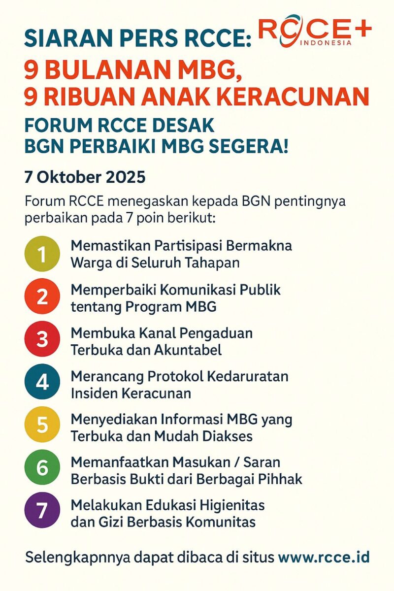 Forum RCCE (Risk Communication and Community Engagement) *sepakat dengan semua poin rekomendasi* yang disampaikan Pokja MBG – CISDI, GKIA, dan JPPI saat audiensi dengan Komisi IX DPR tersebut diatas yang meliputi evaluasi, perbaikan tata kelola, rancang ulang program, partisipasi warga, keamanan pangan, pemenuhan gizi sesuai pedoman Kemenkes dan pembatasan ultra-processed food serta makanan tinggi gula, garam, lemak (GGL) pada MBG.